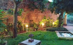 Heritage architecture in lush greenery, peaceful location near nature, live music every evening