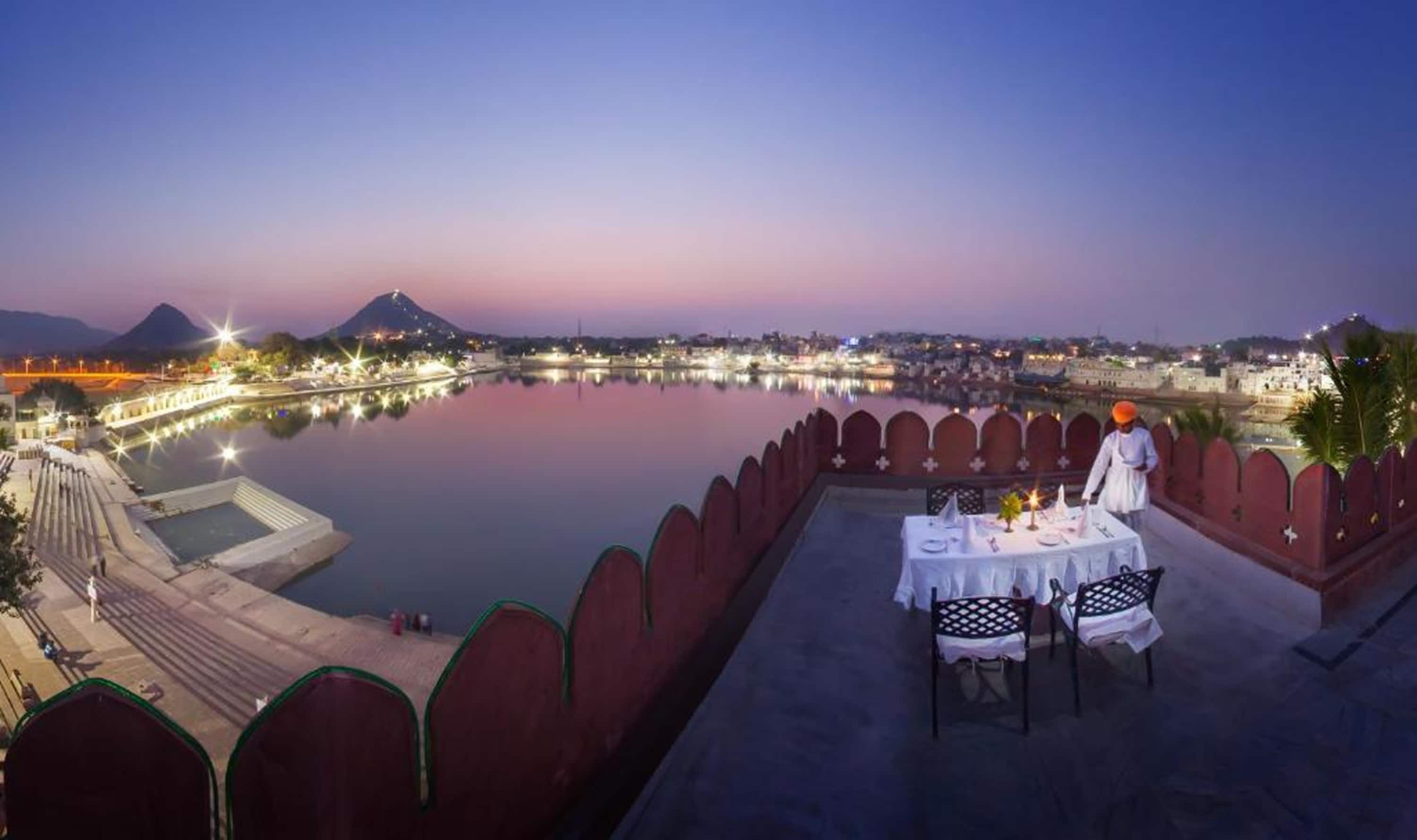 The rooftop terrace provides panoramic views of Pushkar Lake.