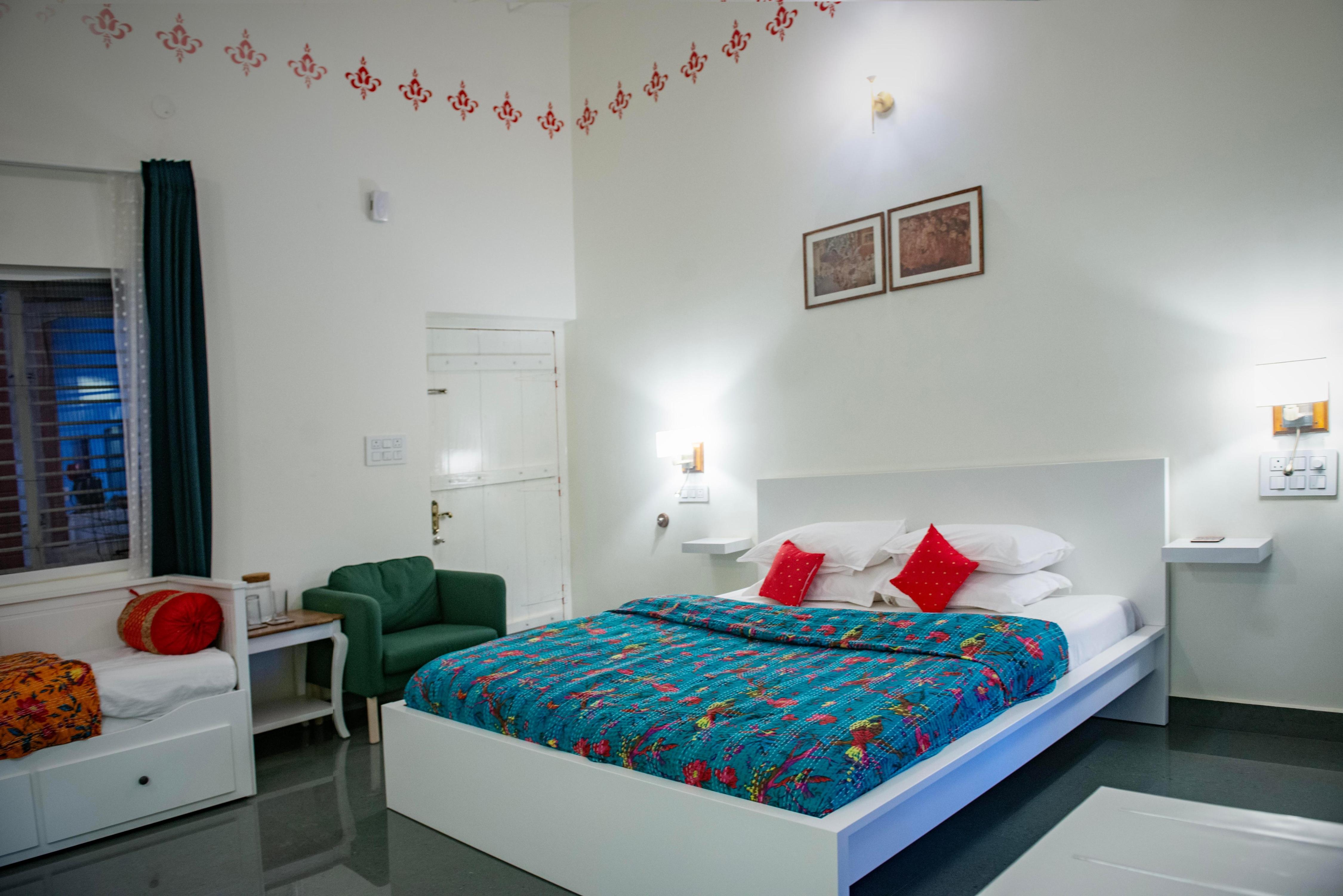 1 Queen Bed, extra 1 Mattress available , Attached Bathroom